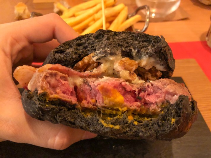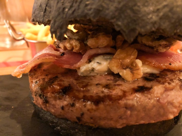 Decidiamo di entrare e sfruttare il menù a prezzo fisso offerto a pranzo che include coperto, acqua e pane. Io sfoglio velocemente la lista ma riconfermo la mia scelta e ordino la New Entry Stagionale. Non rimango deluso. Questo hamburger è caratterizzato da un particolare pane nero che racchiude 200g di Angus, crema di zucca, bacon croccante, zola e noci.