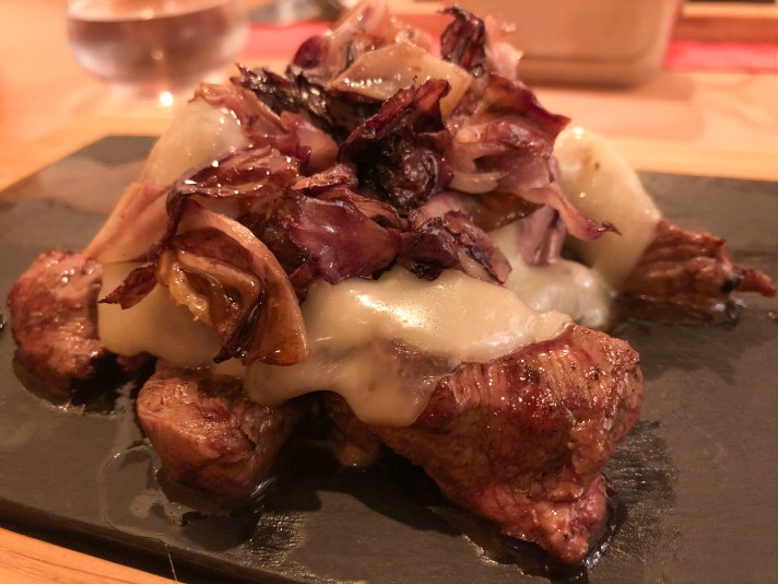 L’altro piatto scelto sono degli straccetti di manzo alla griglia con provolone fuso e radicchio saltato. Anche qui il contrasto tra l’amaro del radicchio ed il gusto corposo del provolone fuso sono una combinazione azzeccatissima.