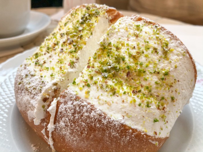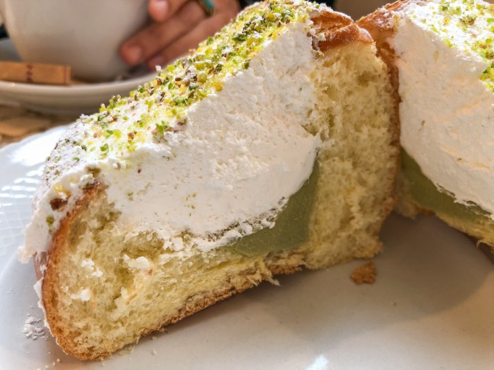 Eccolo qua, il vero protagonista della colazione, il motivo per cui questa giornata andrà sicuramente alla grande: il maritozzo con la panna nella sua variante al pistacchio. Questa bomba di calorie, la cui origine risale ai tempi dell’antica Roma, è il risultato di una pagnotta fatta con farina, uova, miele, burro e sale che viene tagliata longitudinalmente e farcita con abbondante panna montata fresca.