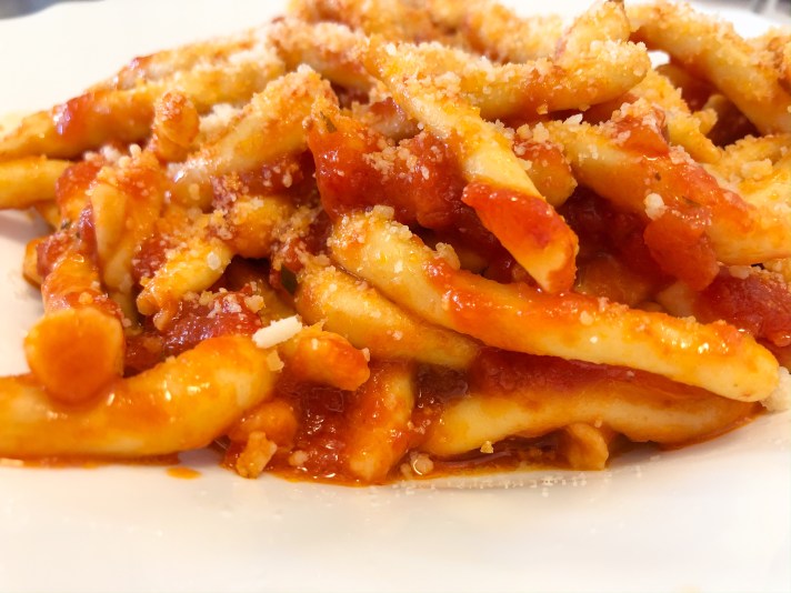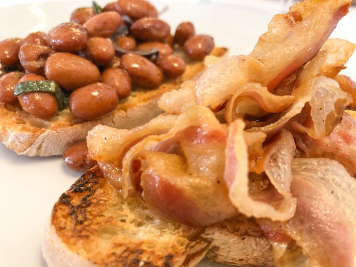 La fame già c’era, ma quando la cameriera mi elenca le specialità locali non vedo l’ora d’iniziare. Decido di partire con delle bruschette con barbazza e fagioli all’uccelletto. La barbazza consiste in della guancia di maiale usata per produrre l’omonimo insaccato che poi, una volta tagliato a fette sottili, viene scottato con salvia e aceto. Invece, i fagioli all’uccelletto, sono dei fagioli tosca belli freschi insaporiti con olio, salvia, aglio, pepe e cipolle rosse. Se è vero che l’appetito vien mangiando, in questo caso già solo annusando il profilo di queste bruschette ero affamatissimo. Il pane caldo con le sue diverse guarnizioni era semplicemente perfetto, il giusto inizio.
