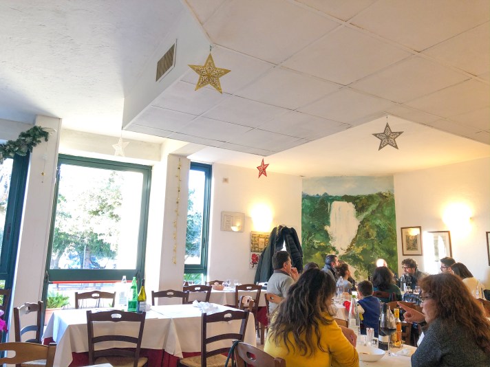 Il ristorante ha un’atmosfera antica e rustica, con sedie di legno e clima informale. Il periodo di feste e i suoi addobbi fanno il resto.