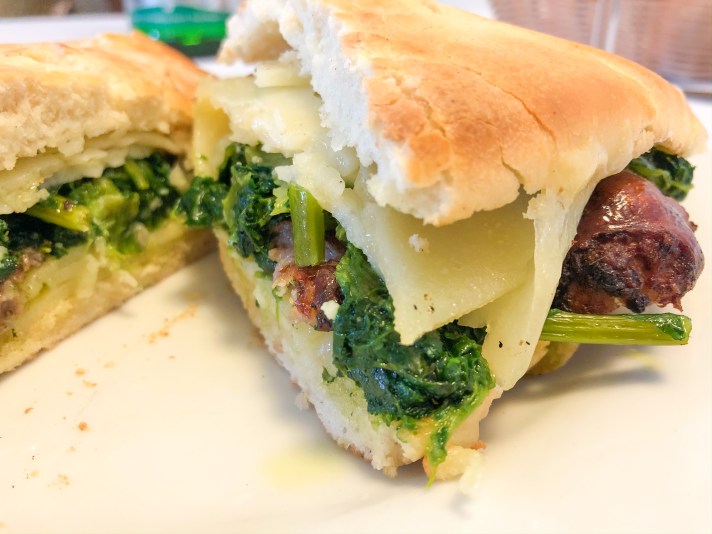 Preso dalla foga e dalla fame, continuo con un altro piatto tipico, la pizza al testo. Il pane, così come il suo contenuto, viene cotto sulla brace dell’enorme focolare e poi farcito con broccoletti, salsiccia e formaggio. Una goduria di sapori con quell’inconfondibile odore di brace.