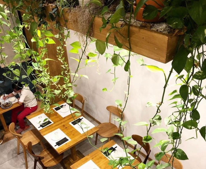 Per entrare dovete premere un pulsante sulla sinistra che aprirà una porta scorrevole di legno, un po’ diverso dalle solite porte scorrevoli automatiche ma ci sta. Gli interni sono molto semplici e con mobilio in legno chiaro, a contrasto solamente con i muri bianchi ed il verde di alcune piante. I tavoli sono disposti sia al piano terra che ad un piano rialzato, un soppalco chiuso da particolari finestre con trame in legno.