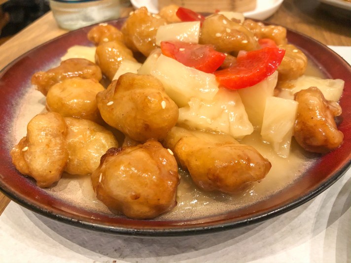 Si continua con un altro piatto più recente che fu creato per accomodare i gusti di alcuni ospiti russi che nel 1907 giunsero in visita nella città di Harbin, nel nord est della Cina. Questo piatto infatti è sviluppato su un gusto agrodolce, creato tramite l’utilizzo di peperoni e ananas. Un gusto che mi ha stupito in positivo e mi ha lasciato piacevolmente sorpreso quello del pollo alla salsa Sichuan.