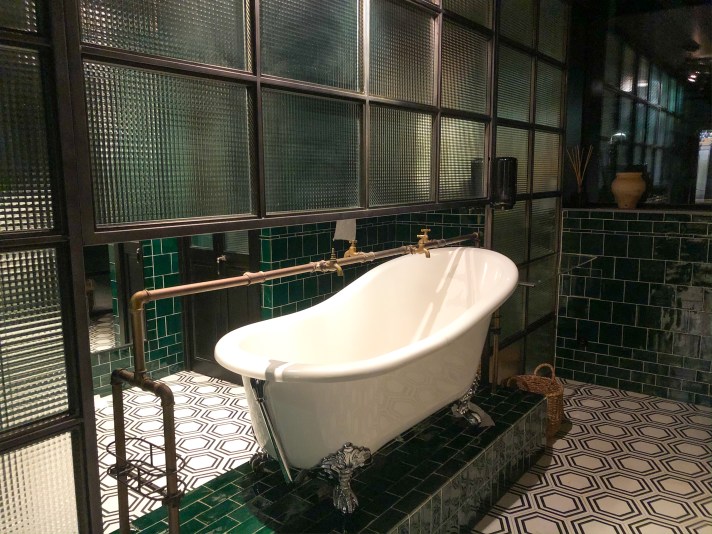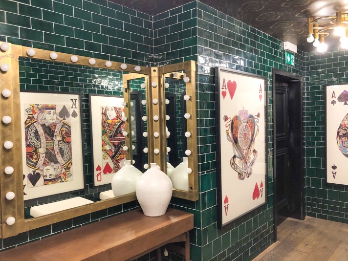 Carte da gioco giganti decorano le pareti e una vasca da bagno vintage centrale fa da lavandino condiviso, a metà tra la parte per le donne e quella degli uomini, favorendo incontri a dir poco interessanti.