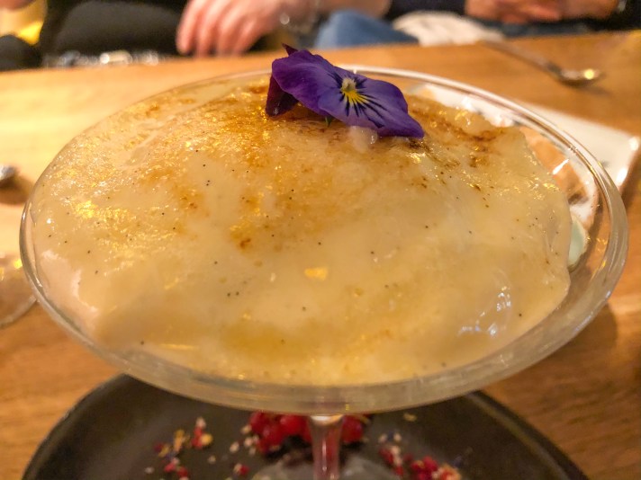 La crema catalana ha un aspetto molto raffinato con questo fiorellino viola adagiato sopra che quasi quasi mi ferma dal affondare una cucchiaiata decisa. Lo faccio lo stesso e la sua consistenza zuccherina con quel poco di croccante esterno mi si spalma in tutta la bocca.