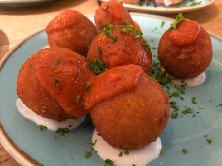Infine, a chiudere il cerchio, due tipi diversi di croquetas adagiate su una salsa all’aglio decisa. Sia quelle con ripieno di Pata Negra, sia quelle con ripieno di formaggio e chorizo iberico si sposavano alla perfezione con la salsa ed esplodevano in bocca. Ma attenti che bruciano un sacco appena fatte.