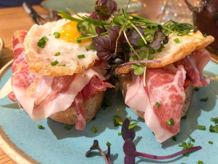 Si continua con un piattino di montadito iberico che vede appoggiati su del pane morbido rispettivamente: manchego, un formaggio spagnolo di capra a pasta pressata; Pata Negra, o prosciutto iberico ottenuto da maiali di razza iberica; uovo fritto, ma nel lardo e erette a guarnire. Si può finire in un morso solo, ma vi consiglio di farlo in due morsi così da gustarvi “di più” ciascun boccone.