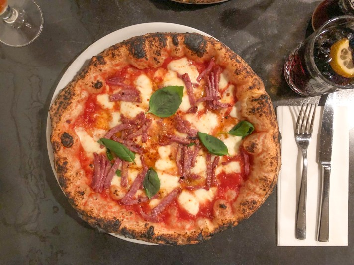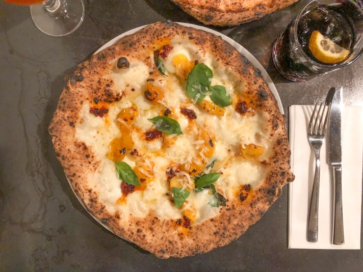 Dopo tutte le difficoltà per arrivare, quella che ci vuole è proprio una pizza speciale, una Marì. Tanto bella a vedersi quanto buona. Fatta con pomodoro giallo della valle del Vesuvio, fior d’Agerola, nduja di Spilinga, caciocavallo Orobianco e Parmiggiano Reggiano 24 mesi. Il cornicione ha una buona consistenza ma al contrario di altre pizze non risulta affatto pesante o ciccoso. La pizza nel complesso è strepitosa, assolutamente da provare senza chiedere alcuna modifica.