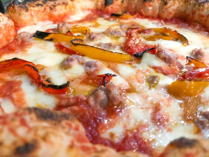 Per variare rispetto ad un grande classico, prendiamo anche una Paesana. Il cornicione voluminoso, ma non in maniera esagerata, racchiude al suo interno la provola affumicata ricoperta da salsiccia napoletana e peperoni rossi e gialli. L’affumicatura della provola è ben bilanciata dalla salsiccia e si sposa alla perfezione con i peperoni: un mix sicuramente ben riuscito.
