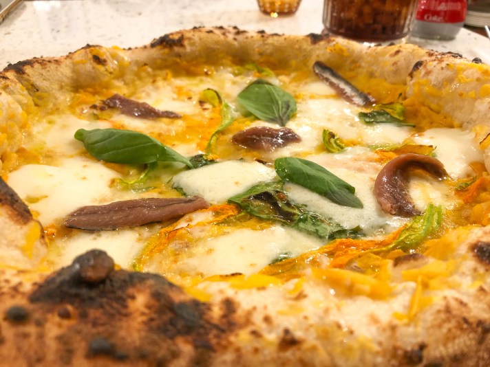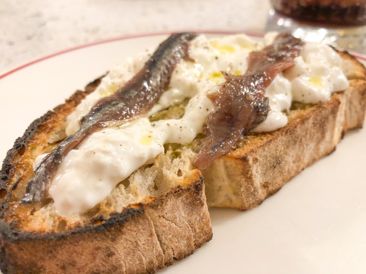 Prima che arrivi la pizza, una bella fetta di pane croccante coperta con della stracciattela e due filetti di alici di Cetara è proprio quello che ci vuole. Salata e saporita stuzzica le papille gustative e le prepara per la protagonista.