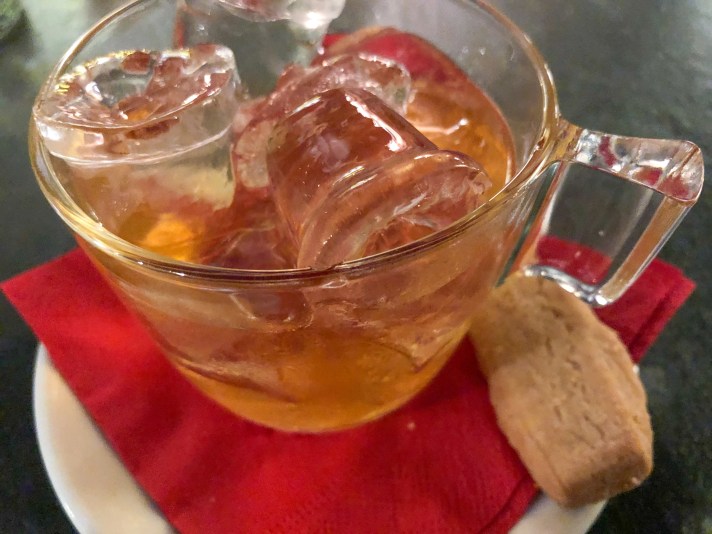 Le possibilità tra cui scegliere sono pressochè infinte, dal più classico gin e tonica da comporre con quello che si preferisce ai cocktail più elaborati ma rigorosamente a base gin. Per questa volta prendo uno dei loro signature cocktails per volare, almeno con i sapori, in America. Il Cookie è un cocktail decisamente gustoso, il cui gin ricorda i classici biscotti americani appena tirati fuori dal forno mentre le note di cannella mi fanno venire in mente le tipiche kanenbullar svedesi. Dando un’occhiata alla lista degli ingredienti si spiega tutto. Per creare questo cocktails vengono usati del gin Johdpur al burro biscottato, sciroppo d’acero, chocolate bitter, orange bitter e profumo alla cannella con l’aggiunta, a lato, di un biscottino al burro a completare il tutto.