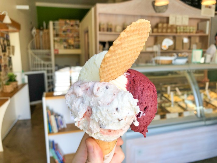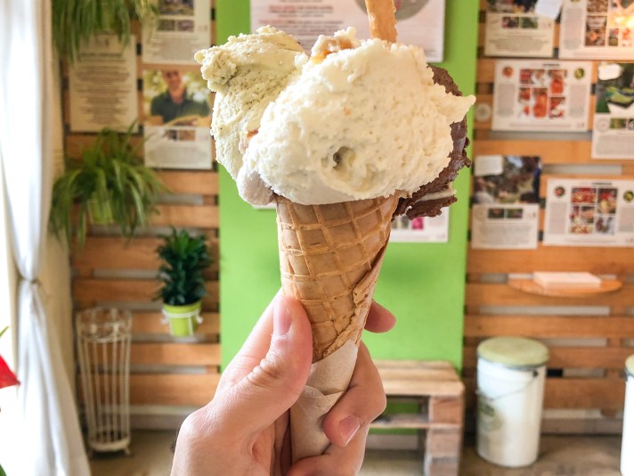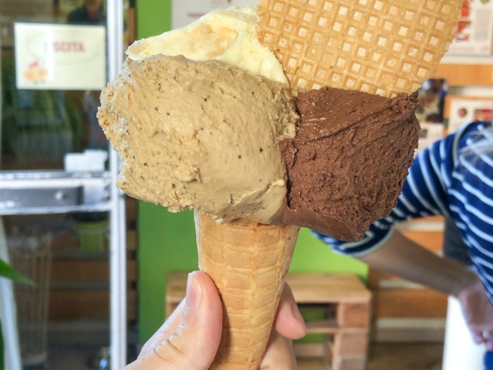 Il terzo ed ultimo cono ha un bel primo piano sul gusto cassata siciliana, alla sua sinistra un classico e sempre buono pistacchio di Bronte e sulla destra torta paesana in tutta la sua bontà.