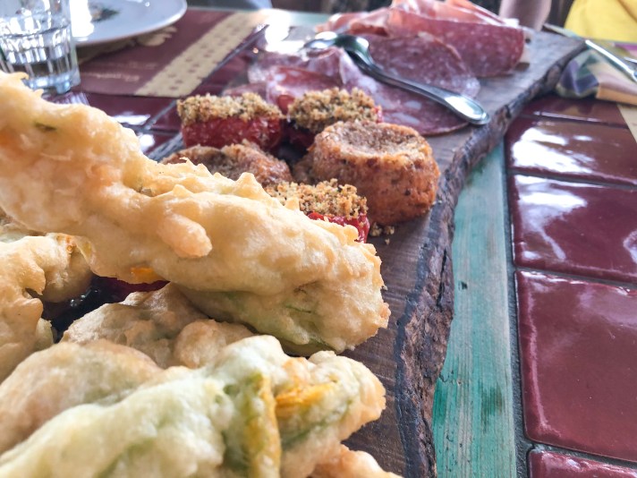 Il tutto ci viene servito su di un solo tagliere con 4 fiori di zucca ripieni, 4 pomodorini gratinati, 2 tortine di riso alla pappa al pomodoro e dei salumi locali. Buono seppur un po’ troppo contenuto nelle dimensioni.