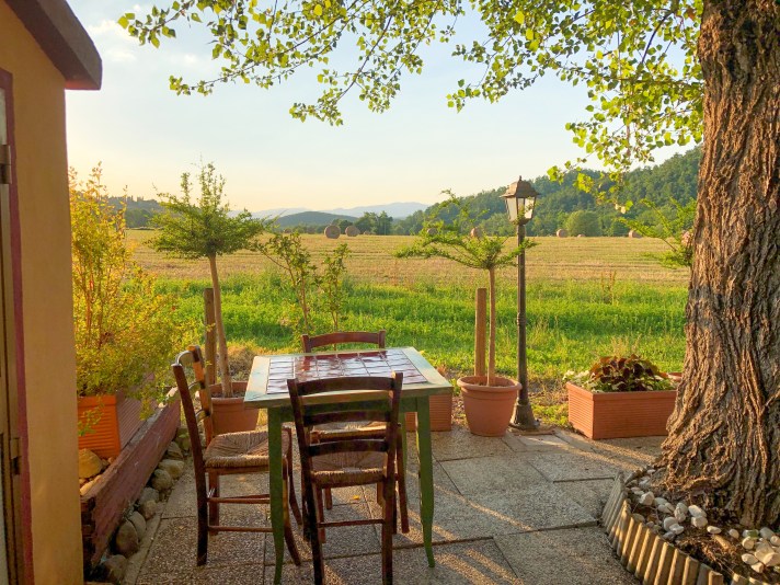 Il posto ha uno stile particolare, un mix tra ristorante e osteria toscana molto carino. Ma il vero punto di forza è lo spazio esterno che al tramonto s’illumina di una luce pazzesca che colora i campi di fronte con le balle di fieno lasciate a riposare.