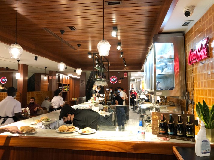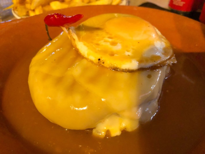 Per variare, qui propongono la francesinha con il pane tagliato in forma rotonda e un piccolo peperoncino infilzato su di uno stuzzicadente come decorazione. Carino il peperoncino ma non c’entra nulla con gli ingredienti del piatto. In ogni caso, ogni morso è una soddisfazione. Un piatto gustoso che ti scalda dentro e ti fa assaporare tutti i vari strati di carne.