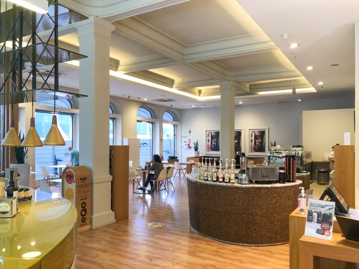 Il design è moderno con tavolini ricoperti da lastre di marmo molto belle. Il servizio al tavolo per il momento è sospeso causa norme anti-COVID ma tutti sono molto gentili e veloci nel servirvi.