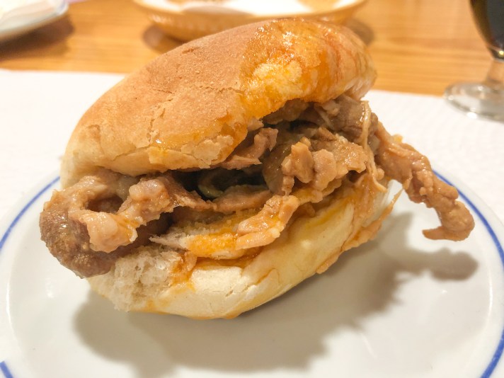 Piatto forte della serata è la tipicissima bifana. Questo panino super portoghese è farcito con lonza di maiale cotta con alloro, vino bianco e altre spezie. Il sapore finale è veramente particolare e gustoso.
