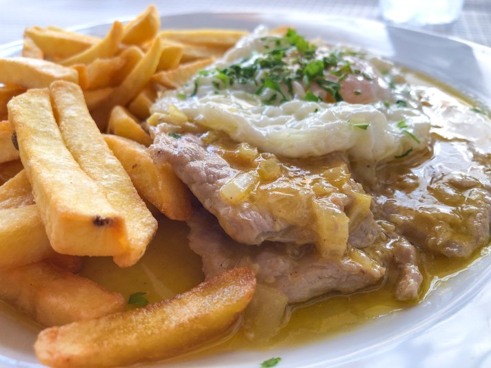Per ridarmi la carica dopo un’intensa mattinata a camminare nel parco del Palacio da Pena decido di ordinare un bitoque de porco. Questo piatto consiste in un bistecca coperta da un uovo fritto e accompagnata da patate fritte. Nella sua semplicità è semplicemente perfetto se avete bisogno di una bella carica per il resto della giornata..