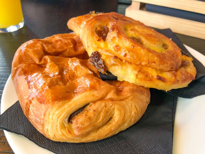 Seduto di fianco al forno mentre file su file di baguette vengono cotte, mi preparo per gustare due classici. Il pan au chocolat è semplicemente il dolce che mette tutti d’accordo, dai grandi ai piccini, grazie al suo gustoso ripieno cioccolatoso. D’altra parte il pain aux raisins con il suo sapore leggermente più sofisticato, grazie all’uvetta e al pizzico di cannella, si difende benissimo e lascia più che soddisfatti in queste prime giornate autunnali.