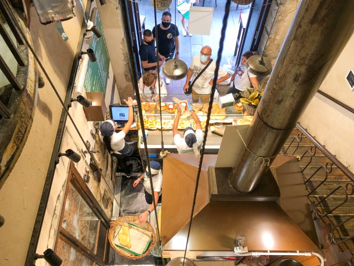 Sfruttando le sedie ed i tavoli al piano superiore, facciamo una pausa mentre aspettiamo le nostre ordinazioni. Per prima ecco la mia margherita a portafoglio, la regina dello street food napoletano. L’impasto è leggermente croccante ma anche soffice ai bordi.