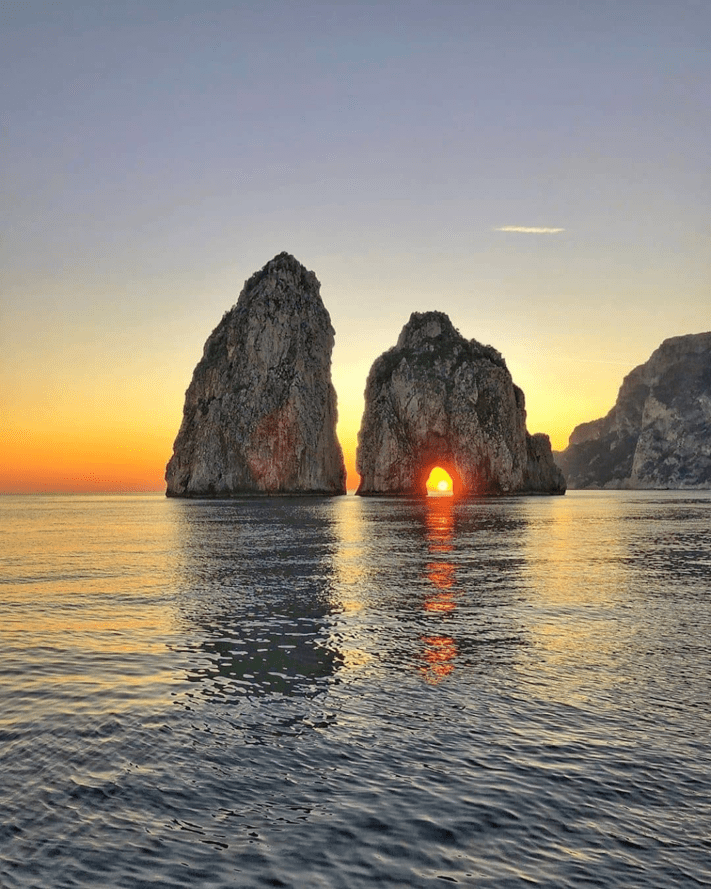 – Faraglioni: sono tre picchi rocciosi posizionati a sud-est dell’isola di Capri, famosi in tutto il mondo anche grazie alla suggestiva e storica panoramica offerta dai giardini di Augusto. Queste sporgenze sono identificate con tre nomi distinti: il primo e più alto con i suoi 109m (unito alla terraferma) è il Faraglione di Terra (o Stella); il secondo, separato dal primo dal mare ed attraversato per intero da una galleria di 60m, è quello di Mezzo (o Saetta) alto 81m; mentre il terzo, proteso verso il mare e alto 104m, è il Faraglione di Fuori (o Scopolo). Quest’ultimo è molto noto poiché è l’unico habitat della famosa lucertola azzurra. Un consiglio: se rimanete fino al tramonto in barca a Capri, potrete vedere il faraglione di Mezzo incorniciare il sole nel foro naturale solitamente attraversato dalle barche.