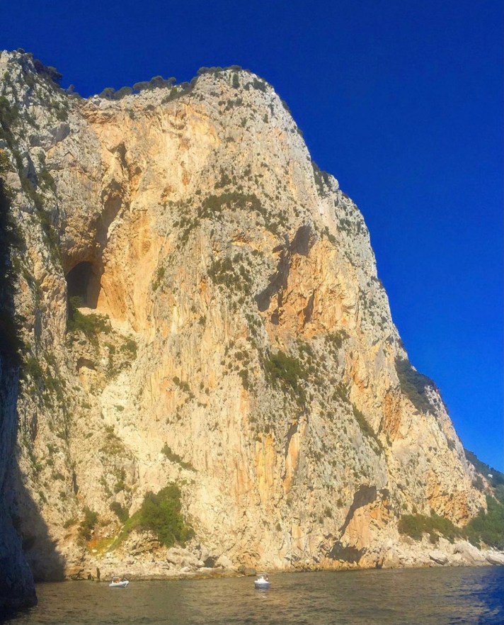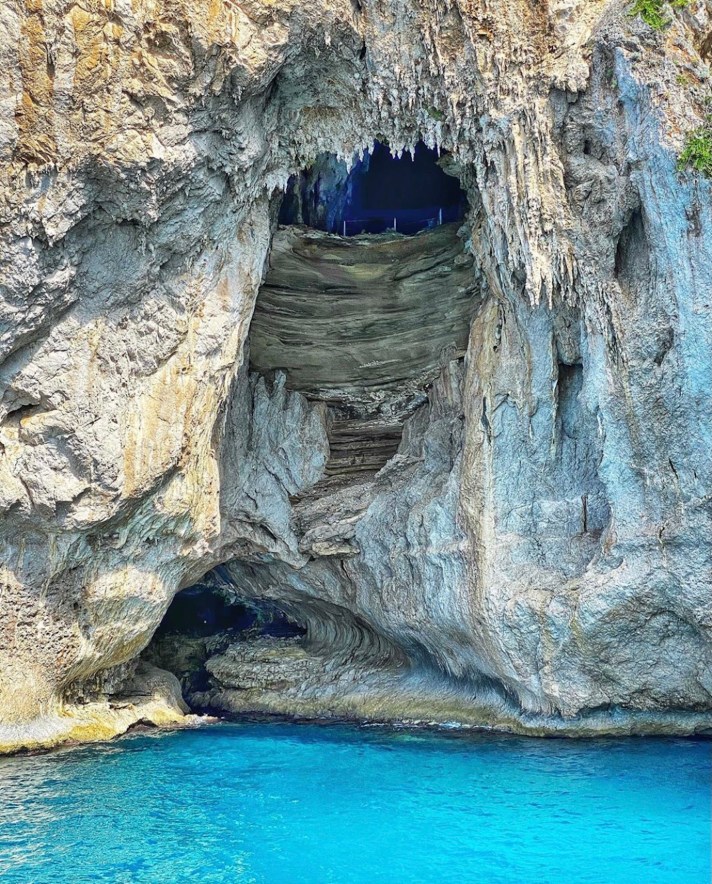 – Grotta Azzurra: è una cavità carsica che si apre nel versante nord-occidentale dell’isola di Capri alla quale si può accedere solo grazie a dei barcaioli in coppie o gruppetti di massimo tre persone, pagando un biglietto di 14€ ciascuno. In età romana, ai tempi di Tiberio, la grotta era utilizzata come un ninfeo marittimo. L’antro, infatti, costituiva una vera e propria appendice subacquea ad una villa augusto-tiberiana detta di Gradola, oggi ridotta a pochi ruderi. Testimoni di quest’utilizzo sono le numerose statue romane, rappresentanti Poseidone, un tritone ed altre creature marine che in origine dovevano esser state disposte lungo le pareti della caverna. Dopo il tramonto dell’Impero romano, la grotta fu condannata ad un lungo ed inesorabile declino. Non fu completamente dimenticata, tanto che il nome di Gradola, per esempio, figurava già nel 1696 in una carta geografica dell’Isolario di Vincenzo Coronelli. Ciononostante, nessuno osava avventurarsi al suo interno, poiché alcune antiche leggende capresi volevano la grotta abitata da spiriti e diavoli e chi l’avesse visitata avrebbe perso il senno. La Grotta Azzurra è articolata in un sistema sotterraneo carsico costituito da più ambienti, sconosciuti ai visitatori che vedono solamente quello più ampio, universalmente noto come Duomo Azzurro. L’ingresso è una fenditura nella roccia alta 2m e lunga altrettanto, che si trova, quando il mare non è mosso, a solo 1m dal livello del mare. Di conseguenza, quando si entra nella cavità, bisogna adagiarsi sulla barca che richiede la presenza di un barcaiolo esperto. Questo, abbandonati i remi, spinge la barca appigliandosi ad una catena di ferro che è murata sull’ingresso. Una volta entrati, si è al cospetto del Duomo Azzurro. Questa grande cavità di erosione è profonda 22m (14m nell’interno), larga 25m e lunga circa 60m. L’altezza media della volta è pari a 7m, aumentando fino a 14m nelle zone interne. Considerando anche la soglia subacquea, l’altezza totale (che va fino al soffitto) è uguale addirittura a 36m. La colorazione blu della grotta è dovuta alla presenza della soglia sottomarina (che si apre esattamente sotto l’ingresso) attraverso cui penetra la luce. La finestra subacquea agisce da filtrante, assorbendo i colori rossi e lasciando passare quelli blu. Curioso notare che, a causa del fenomeno della riflessione totale, la soglia non riesce ad illuminare l’antro se il mare è completamente calmo, quindi c’è bisogno di un movimento dell’acqua, per quanto questo possa essere minimo. Lo sfolgorio color argento degli oggetti immersi, invece, è riconducibile ad un altro fenomeno: sulla superficie dell’oggetto aderiscono diverse bolle d’aria che, avendo un indice di rifrazione differente da quello dell’acqua, lasciano uscire la luce.