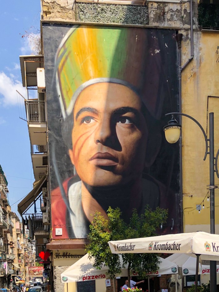 – Murales di San Gennaro di Jorit Agoch: l’opera è nella piazzetta all’altezza di Spaccanapoli e l’autore è Jorit Agoch, giovane artista napoletano, di madre olandese. Il San Gennaro di Jorit ha un’altezza di 15m ed è molto bello come le altre sue opere: all’inizio c’è stata qualche polemica sul volto subito stroncata dall’artista che ha dichiarato che il volto assomiglia ad un suo amico carrozziere cui si è ispirato e che la foto di questo signore sarà mostrata più in là. Jorit Agoch si ispira dunque alla gente comune, quella che vedi per strada ogni giorno, così come faceva Michelangelo Merisi, il Caravaggio, che ha immortalato nei suoi quadri gente di strada.
