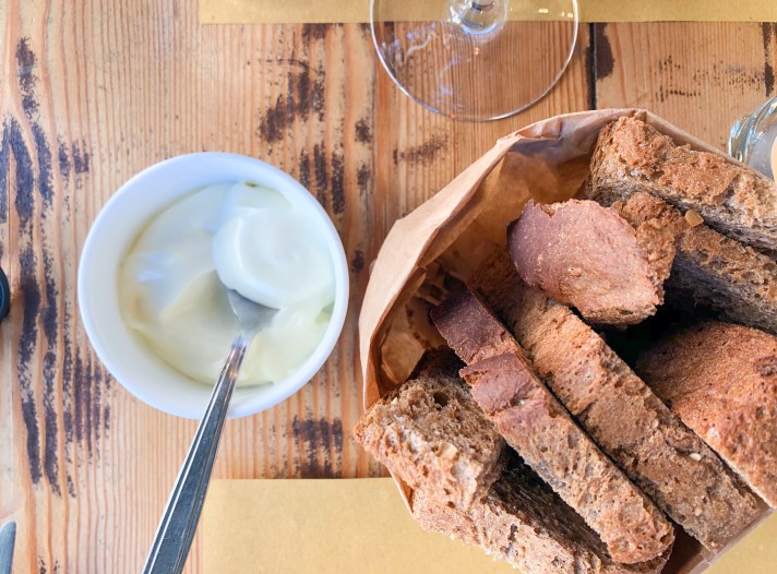 Ci sediamo e per ingannare l’attesa mentre scegliamo cosa ordinare ci viene portato un piccolo e semplice stuzzichino: una maionese fresca e fatta in casa con una marcata nota agrumata accompagnata da del pane integrale in cassetta. Un’accortezza gradita e gustosa.