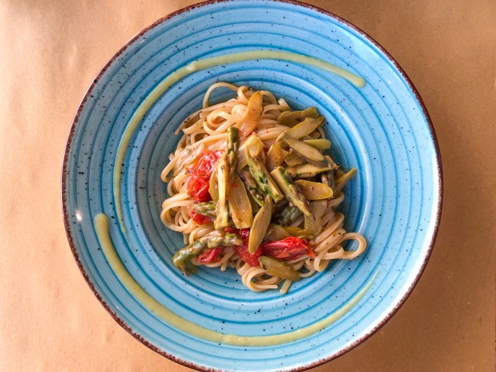 La variazione del primo, senza ricci di mare, risulta vincente. Le linguine legano bene con i pomodori datterini confit e le punte di asparago tagliate a listelli. Unica pecca, se si vuole proprio trovarne una, è la quasi assenza di sughetto che lascia la tanta pasta leggermente asciutta.