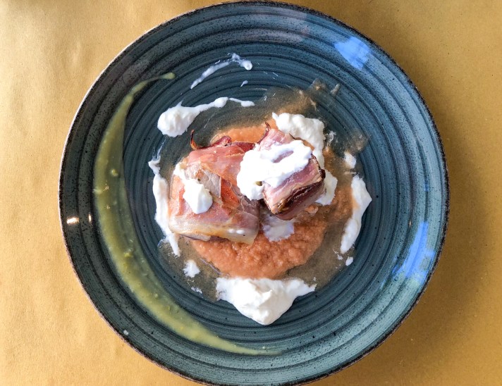 Per iniziare ordino un antipasto che m’incuriosisce. Si tratta di un cubo di tonno in manto di speck su coulis di cuore di bue e stracciata di burrata. L’impiattamento è curato ed i singoli ingredienti sono di qualità, nulla da ridire, ma ci sono dei ma. Trattandosi di un antipasto non dovrebbe saziarmi, cosa che invece i due cubi di tonno da circa 100g l’uno fanno. In aggiunta, per essere ancora Febbraio, la coulis di cuore di bue e la stracciata di burrata raffreddano troppo il piatto, dettagli che sarebbero sicuramente più apprezzati in primavera inoltrata quando le temperature saranno più alte. Infine, il sapore delicato del tonno è sovrastato completamente dagli altri ingredienti, in primis dallo speck.