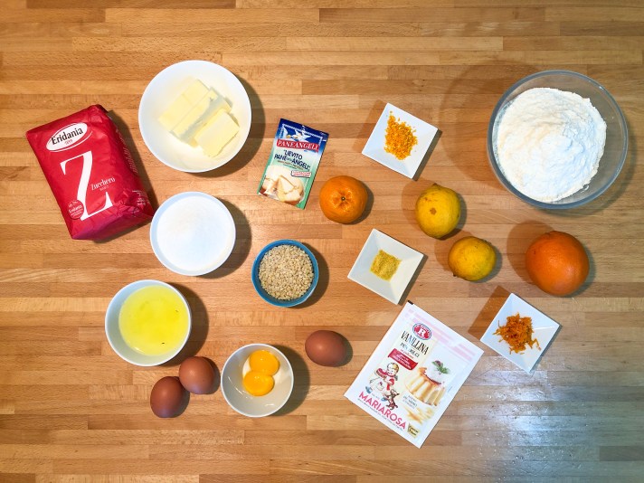 - Versate la scorza grattugiata di un’arancia e di un mandarino assieme a quella di mezzo limone