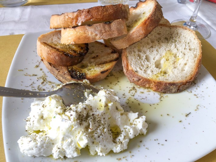 Si preannuncia una gran mangiata ricca di vino e quindi meglio partire facendo un po’ di fondo. Iniziamo con una formaggina di Osmate veramente saporita accompagnata da crostoni di pane fatto in casa leggermente tostati e con un filo d’olio extravergine d’oliva.