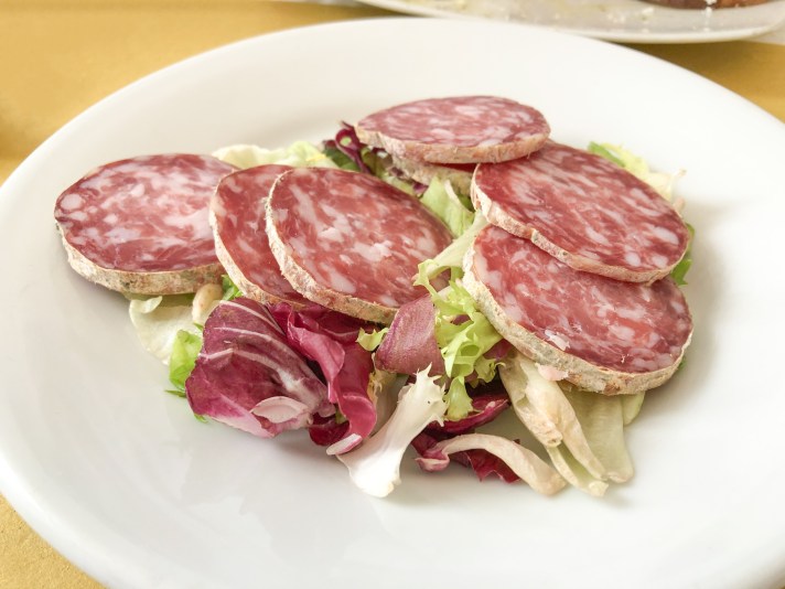 Ad accompagnare i crostoni del gustoso salame della casa tagliato al coltello.