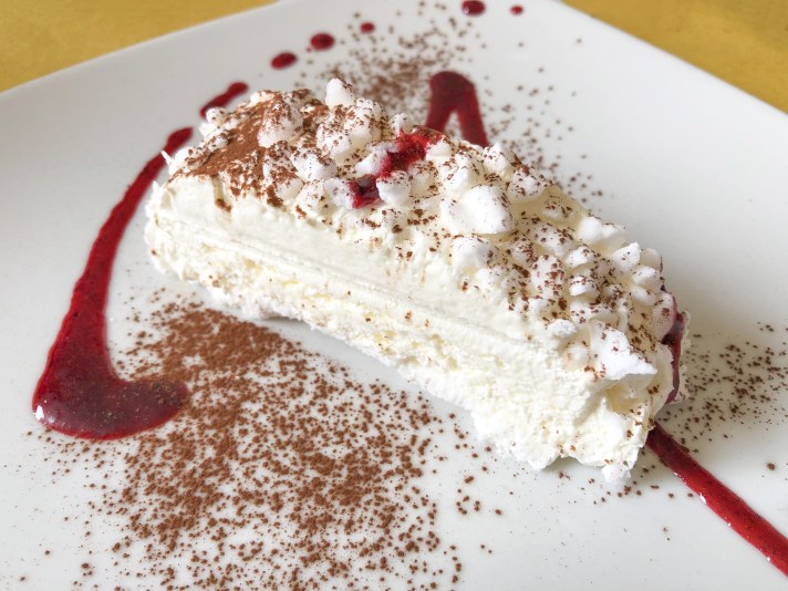 Si chiude in bellezza con una dolce e zuccherosa meringata, decorata con una spolverata di cacao e una striscia di coulis di lamponi, che alleggerisce leggermente la botta di zuccherosità di ogni boccone.