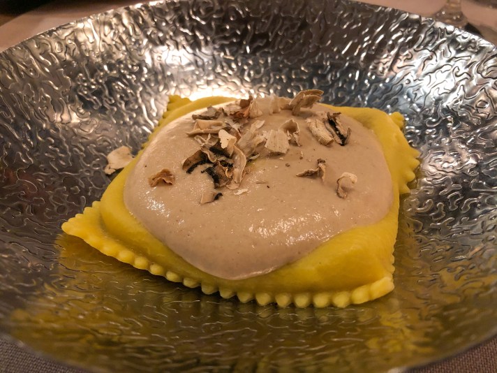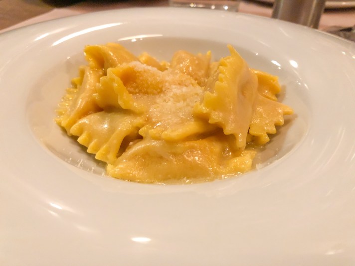 Il primo risolleva tutto, buono e ben bilanciato. Trattasi di semplici agnolotti di zucca cotti con burro e salvia. All’interno, il sapore della zucca è ravvivato con una puntina di noce moscata mentre, all’esterno, il Parmigiano Reggiano spolverato sopra amalgama sapori e agnolotti.