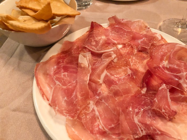 Iniziamo con una serie di antipasti per assaggiare un po’ di tutto partendo con del culatello di Zibello D.O.P. accompagnato da dello gnocco fritto. Il culatello è qualcosa di veramente indescrivibile e super saporito, al contrario invece dello gnocco fritto che sembra sia stato lasciato troppo nell’olio a friggere assorbendone così un po’.