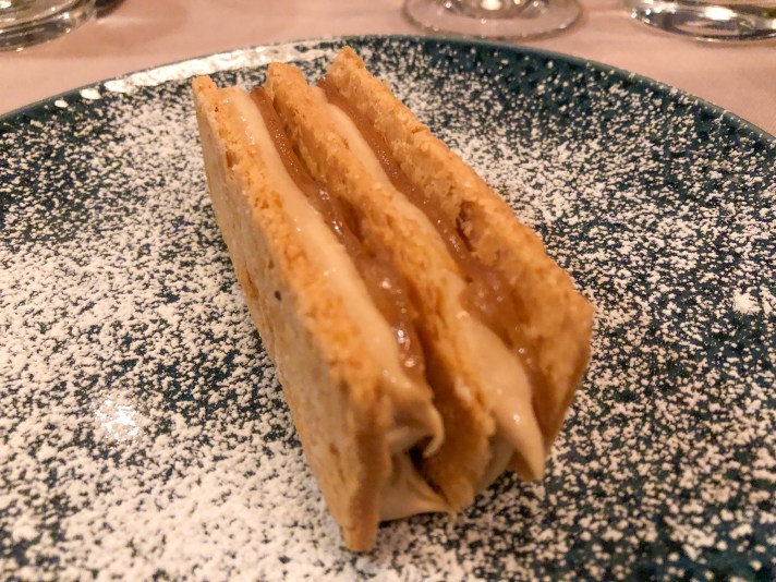 Dulcis in fundo, forse un dessert troppo dolce. Letto dal menù che recita millefoglie di marroni e pere non mi aspettavo per nulla che ci fosse anche del caramello. Assaggiata singolarmente la crema di marroni è buona e delicata con all’interno pochi pezzettini di pera che si sentono appena. Il vero problema resta il caramello usato come “collante” che con il suo sapore molto forte e deciso ha sovrastato in toto il resto.