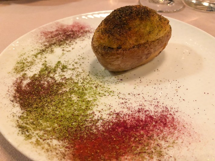 A concludere il tris di antipasti ecco la patata piena di sé e guanciale. Bella la presentazione ma le spezie usate erano puramente decorative, inutilizzate nella ricostruzione del ripieno della patata. Anche in questo caso a parte il sapore classico senza infamia e senza lode di una patata bollita non si sente altro, insomma il guanciale che avrebbe dovuto dare quella nota di sapore più briosa gioca ancora a nascondino.