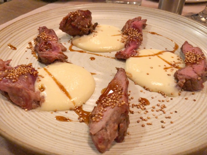 Il secondo è una favola, la carne si scioglie in bocca. Questo piatto è composto da Pluma iberica BBQ con purea di patate affumicate e quinoa soffiata. La Pluma è un taglio di carne che si ricava tra il lombo e il collo del maiale il cui nome deriva dalla sua forma che ricorda una piuma ed è uno dei tagli più pregiati, molto morbido e gustoso.