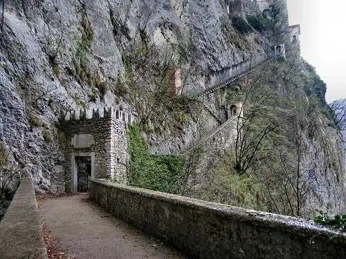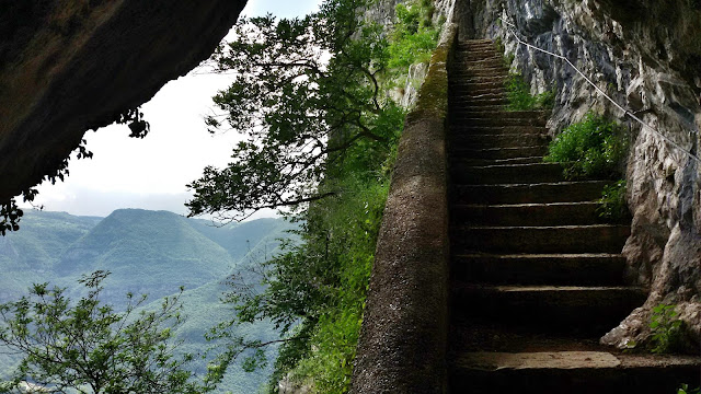 Una scalinata in costante salita prende sempre più quota con splendide vedute sul fondo valle. Sembra quasi che non ci siano passaggi ma invece un’arcigna scalinata, completamente scavata sulla roccia, sale a zig-zag cambiando direzione nella suggestiva Grotta della Pietà dove si trova il libro del pellegrino con tutte le firme delle persone che sono passate di là.