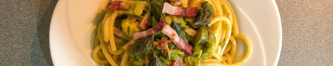Pasta alla Carbonara sbagliata stramazzaromani con asparagi, pancetta e scalogno