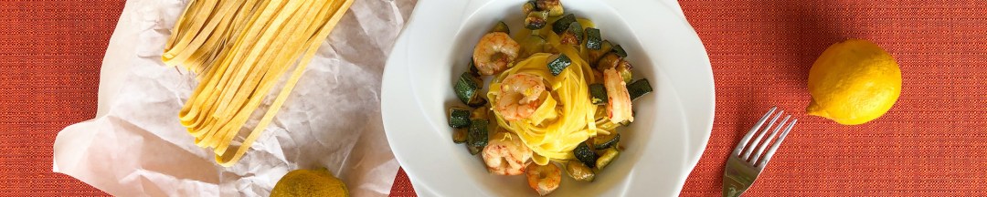 Fettuccine al limone con gamberi freschi, zucchine croccanti e zest di limone
